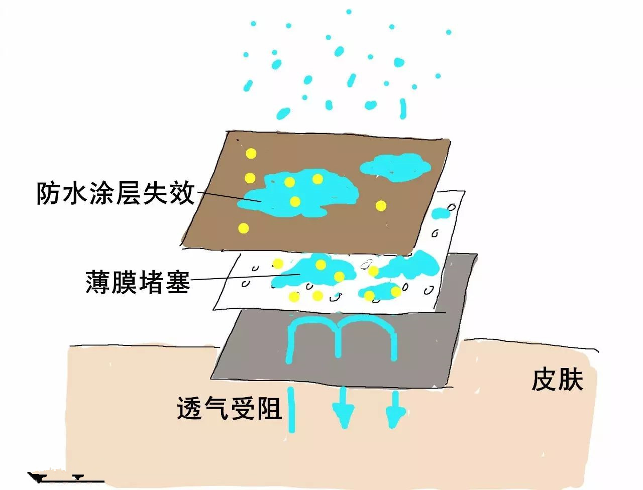 接著:排氣受阻——當污垢徹底攻破涂層防線后,雨水便會附著在衣服表面滲透,薄膜也不能正常工作了。